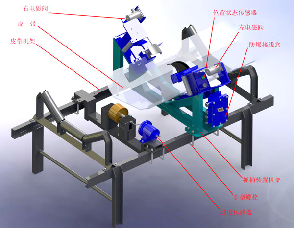 主要特點: 該產品為機電一體化智能型產品,可根據用戶皮帶機的實際運行狀況,通過控制主機(PLC)進行編程,滿足用戶要求,在皮帶安全下滑距離內,不對皮帶進行抓捕。 控制主機選用西門子可編程控制器(PLC),可實現與中控室通訊,與礦山智慧物聯網系統(tǒng)組網,實時監(jiān)控皮帶機的工作狀態(tài)。 通過控制程序實現自動分析皮帶是蠕動下滑倒帶還是斷帶的功能;具有故障顯示查詢、聲光報警功能,可采用多種操作模式。 抓捕皮帶的執(zhí)行機構為一組左、右對稱的敞開式凸輪壓帶方式,體積小,結構緊湊。抓捕皮帶的夾緊力隨著皮帶下滑位移的增大而增加。 該執(zhí)行機構的凸輪壓帶部分為高分子復合材料一次注塑成形,具有強度大、韌性好、重量輕等特點,能保證在抓捕皮帶時與皮帶緊密接觸,防止打滑,不損傷皮帶。 采用沿線多點布置,當速度傳感器檢測到皮帶運行異常(斷帶、倒帶)時,沿途布置的所有斷帶抓捕裝置同時動作,抓捕指令準確無誤,抓捕動作一致,可靠。 該產品具有人工試驗功能,可隨時在現場進行抓捕動作試驗。 獨有的位置狀態(tài)傳感器可實時檢測斷帶抓捕裝置的工作狀態(tài)。